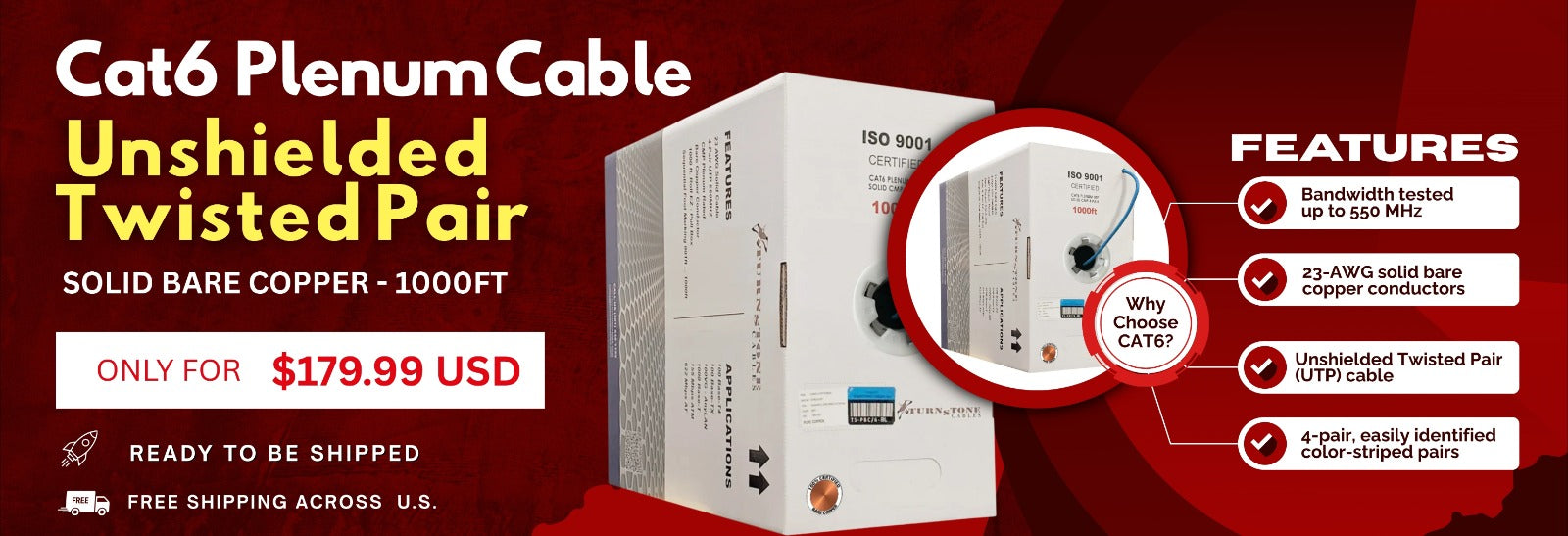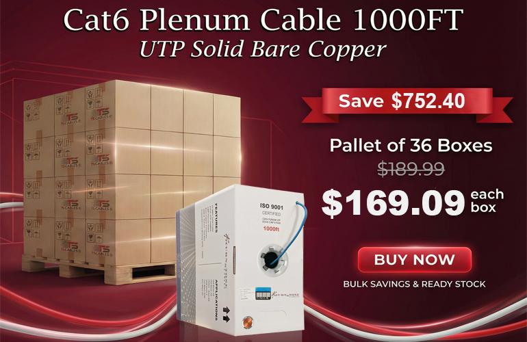 Cat6 Plenum Cable 1000FT UTP Solid Bare Copper Pallet of 36 Boxes